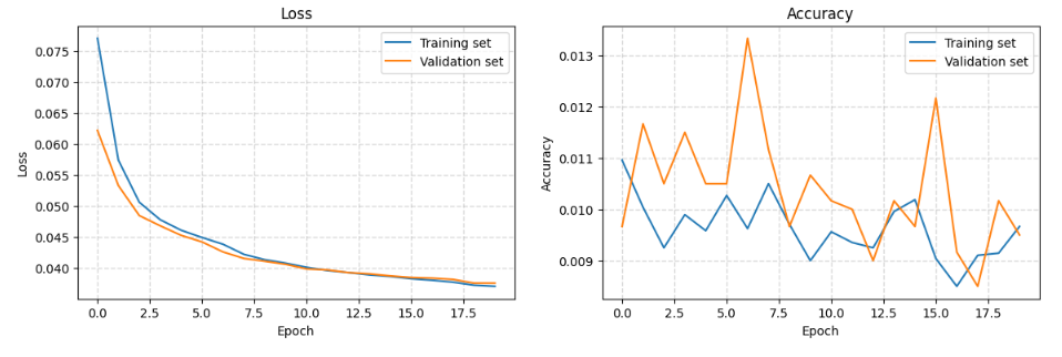 - Результаты обучения модели: loss и accuracy на тренировочном и валидационном датасете